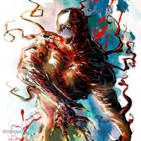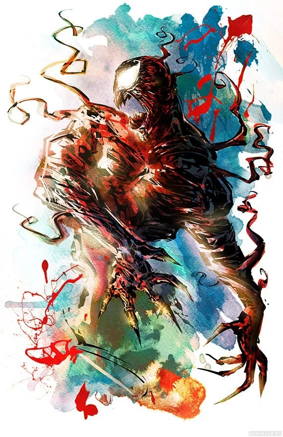 splashes of color, primarily in shades of blue, green, and orange, giving the artwork a vibrant and energetic feel that complements Carnage's menacing appearance.
