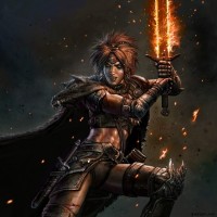 red hair. She is wearing armor and holding a sword, suggesting she might be a warrior or a fighter. There are flames or sparks around her, which could indicate that the setting involves combat or magical elements. The cloak adds to the fantasy theme of the image.