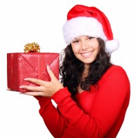a young woman with dark hair, holding up a gift wrapped in red and white. She appears to be happy or excited about the gift. She is wearing a traditional festive outfit that includes