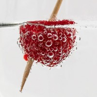carbon dioxide into the liquid. The raspberry has its stem attached to it, which is also submerged in the liquid.