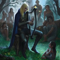 a fantasy scene with an elf character who appears to be a musician. The elf is holding a small harp and seems to be playing or about to play it, as they are focused on the instrument. Surrounding the elf are several other figures that seem to be listening attentively to the music being played. The setting appears to be outdoors in
