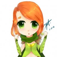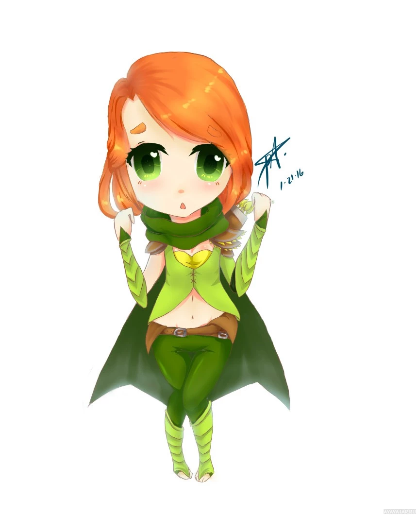 На картинке изображена иллюстрация персонажа из игры «Дота 2». Этот персонаж — Виндрангер, известная своими оранжевыми волосами и зеленым нарядом. Похоже, она держится за шарф обеими руками.