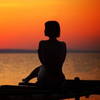 a silhouette of a girl sitting on what appears to be a wooden structure, possibly a pier or dock, overlooking the sea. She is facing the sunset, which suggests it might be