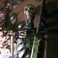 The image depicts a skeleton in an elaborate pose, as if it were a knight or warrior. The skeleton is holding a sword and appears to be wearing armor of some kind. It's sitting on what looks like fallen leaves, possibly suggesting a battlefield or graveyard. The scene conveys a sense of stillness and perhaps remembrance or the aftermath of conflict.