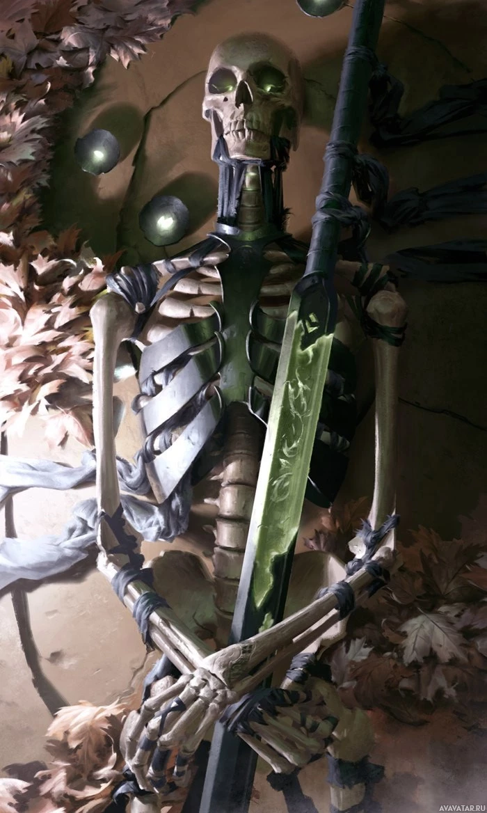 На картинке изображен скелет в сложной позе, как если бы это был рыцарь или воин. Скелет держит меч и, кажется, носит доспехи. Он сидит на том, что выглядит как опавшие листья, возможно, предполагая поле битвы или кладбище. Сцена передает ощущение тишины и, возможно, воспоминания или последствия конфликта.