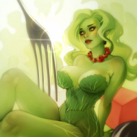 an illustrated character that resembles a woman with green skin and plant-like features, such as leaves sprouting from her head. She is sitting on a large stalk of broccoli with her legs crossed. In front of her, there's a fork that suggests she might be eating or about to eat. Her posture and the presence of the fork give off a vibe of relaxation or enjoyment. The background is not detailed but appears to have