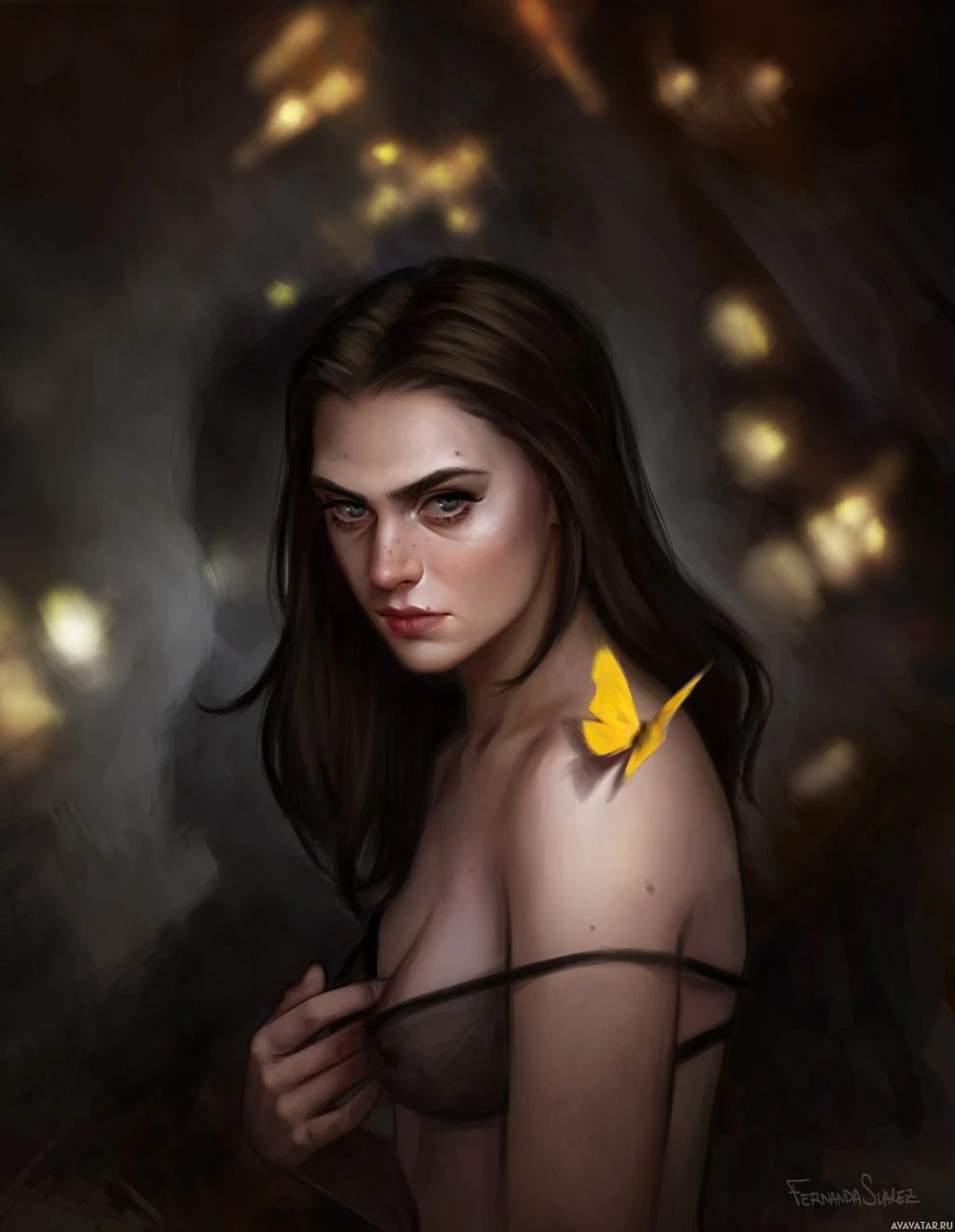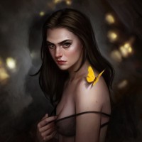 brown hair, looking off to the side with a thoughtful or perhaps contemplative expression. There is also a butterfly perched on her shoulder. She appears to be wearing some sort of top or bra that might not fully cover her shoulders. The background suggests an urban or industrial setting, possibly at night given the darkness and light sources that resemble streetlights or windows with
