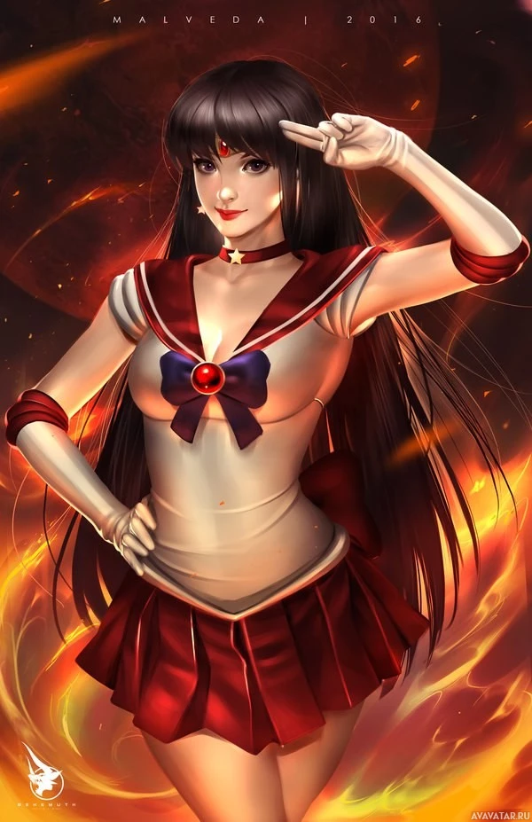 На этом изображении изображен анимированный персонаж, который, кажется, Сейлор Меркурий из серии «Сейлор Мун». Она изображена в динамической позе с одной рукой на бедре, а другая рука поднята, что выглядит как приветственный жест. Фон имеет огненное или взрывное качество, предлагая действие или приключение.