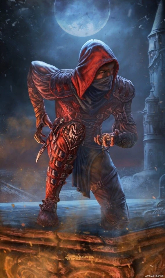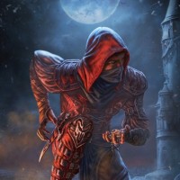 hooded robe, reminiscent of an assassin's outfit, and holds a blade in their left hand. They stand on