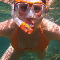 The image shows a woman in the water, likely snorkeling or