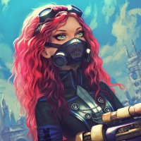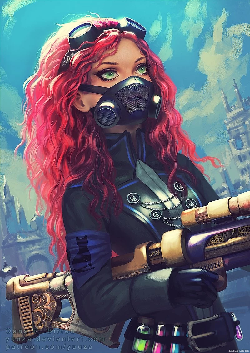 pink hair and a respirator. She is wearing a dark outfit, which includes a jacket, gloves, and what appears to be armor or