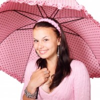 The image shows a young woman smiling at the camera. She has long brown hair and is wearing a light pink outfit that matches her umbrella, which she holds over her shoulder. She appears to be outside during possibly rainy weather, indicated by her holding an open umbrella.