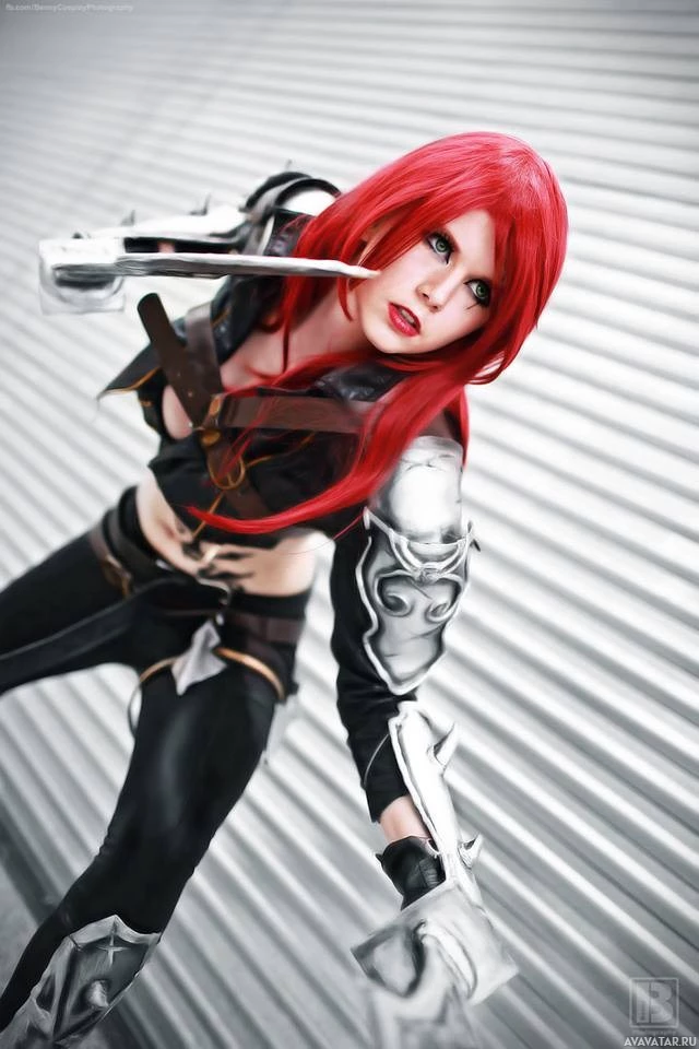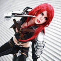red hair, and has their face painted in a dark tone to match the character's appearance. They are holding a weapon that seems to be a staff or spear, which fits the character's theme. The setting appears to be