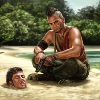 back in the sand. The second man appears to be shaking or making a motion that makes his head bounce off the sand. Both men are equipped with what seem to be pistols, suggesting a context related to conflict or action. The setting appears tropical, with greenery and calm water visible in the background, which could indicate a location used for leisure or