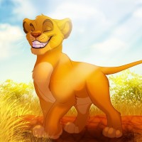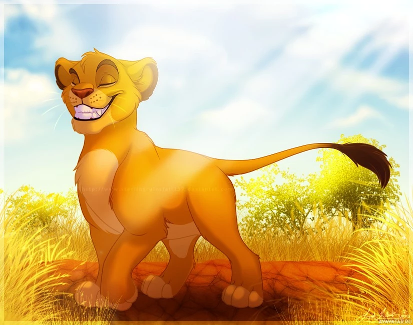 На картинке изображен персонаж Муфаса из диснеевского фильма «Король Лев». Он стоит на освещенной солнцем равнине с желтой травой и деревьями на заднем плане, глядя в сторону зрителя с содержательной улыбкой.