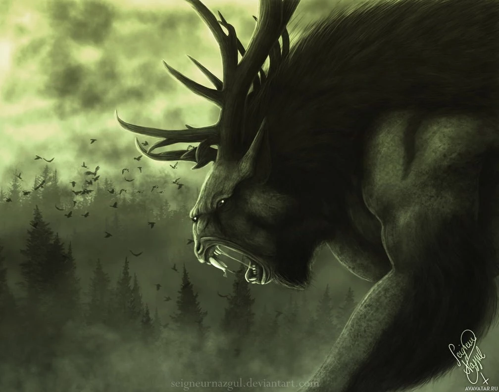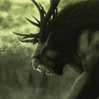 a fantastical creature that appears to be a werewolf or a similar monstrous beast. It has the head and antlers of an elk, with large