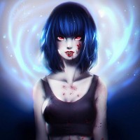 tank top and there appears to be blood splattered on her attire, which adds to the eerie and mysterious ambiance of the image. The background features a cosmic or magical element with swirling colors that could represent energy, magic, or another