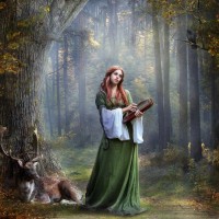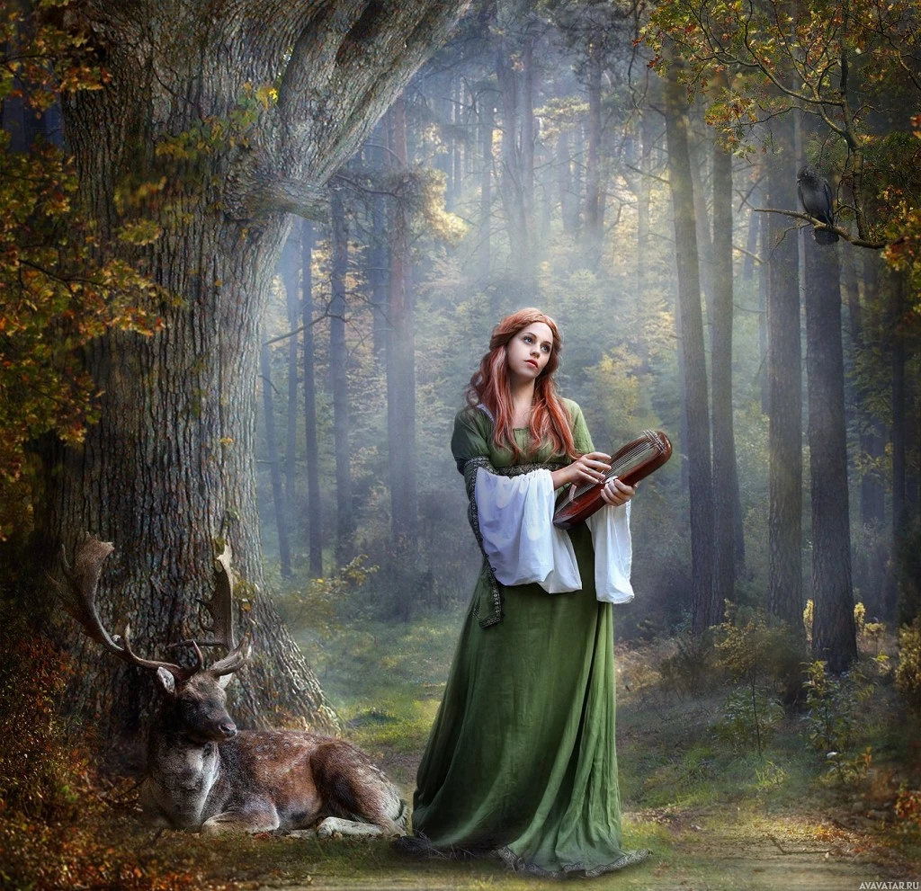 a green dress and appears to be playing an instrument, possibly a harp or lute. There's a deer resting nearby, and the background suggests a misty or magical atmosphere with trees and a hint of a castle or tower peeking from behind the trees. The overall mood of the image is serene and somewhat mystical, fitting