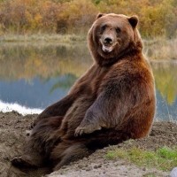 На картинке изображен бурый медведь, сидящий у края водоема. Медведь, кажется, улыбается и находится на открытом воздухе с деревьями и растительностью вокруг. Это классическое представление сцены дикой природы, запечатлевшее момент отдыха или довольства для животного.