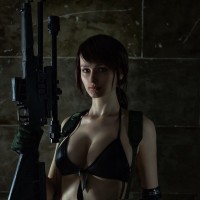 the video game "Metal Gear Solid V: The Phantom Pain." This character is depicted as a female sniper with a distinctive appearance, including
