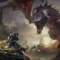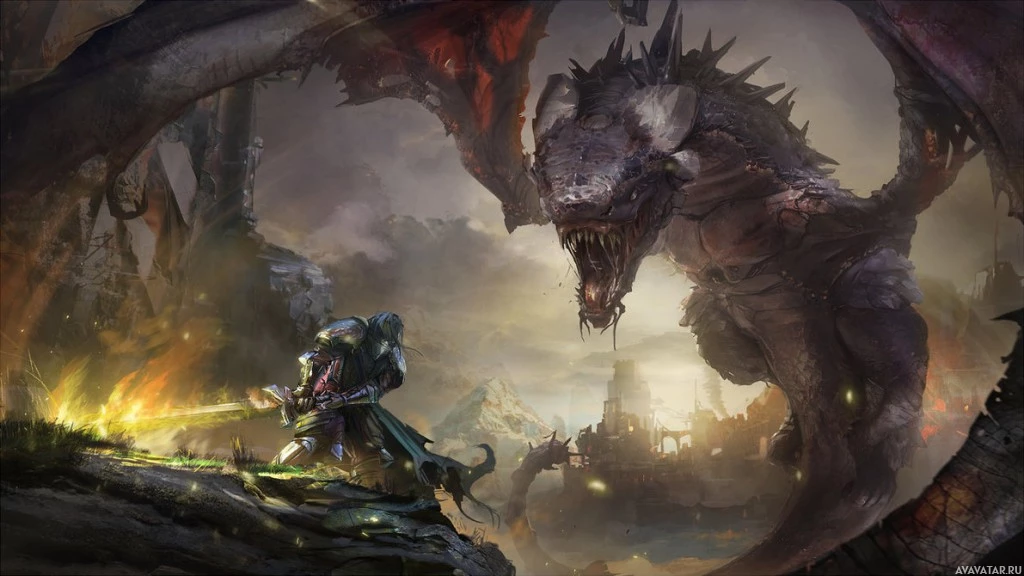 a fantasy scene with two dragons. One dragon is on the left side of the image, and it appears to be smaller than the one on the right. The larger dragon, which occupies most of the right side of the picture, is showing its teeth aggressively towards the smaller dragon and another creature that could be a warrior or another monster. They are in a landscape with ruins and what looks like some sort of