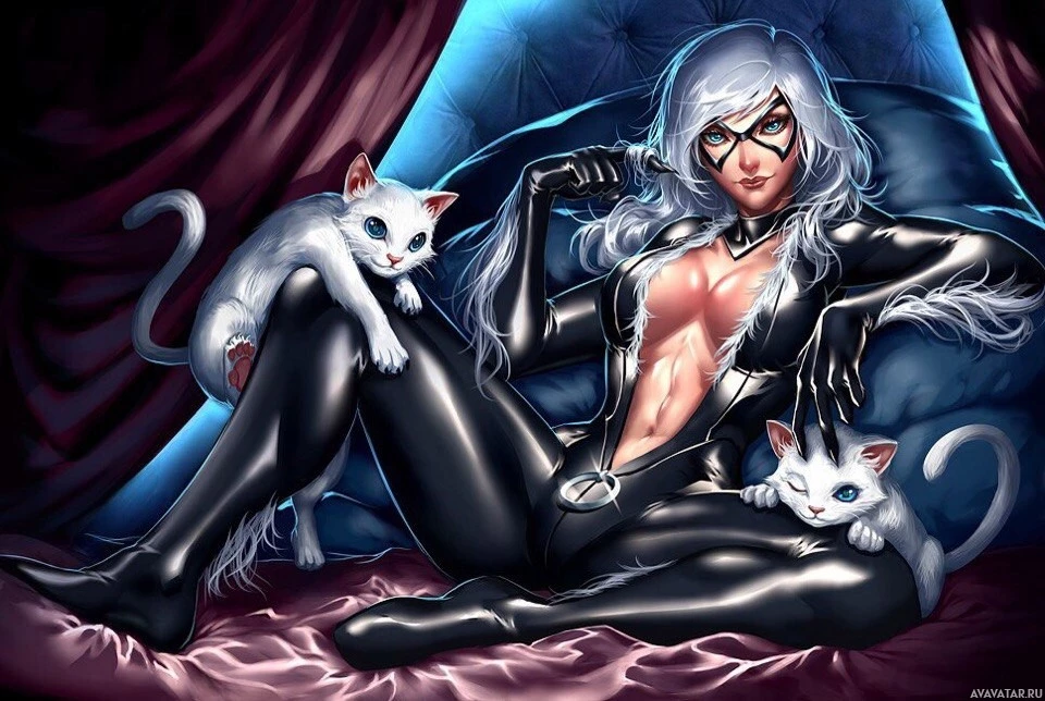 На картинке изображен Черный кот, вымышленный персонаж из комиксов, опубликованных Marvel Comics. Она показана сидящей на кровати или диване с кошкой и другой кошачьей на коленях.