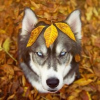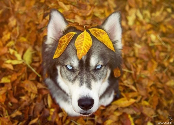 На картинке изображена собака с листьями на голове, сидящая в осенней обстановке. Собака кажется сибирским хаски или похожей породой из-за отличительных отметин и ушей. Окружающая среда покрыта опавшими листьями, что указывает на то, что это, вероятно, осенью, когда дерево сбрасывает листья.