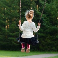a young child sitting on a swing in what appears to be an outdoor park setting. The child is wearing a dress and has