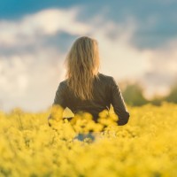 tall grass or crops. The individual appears to be facing away from the camera, giving us a view from behind their back. The background suggests it might be early morning or late afternoon due to