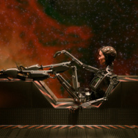 a robotic figure seated nearby, adding to the theme of technology and artificial life within this scene.