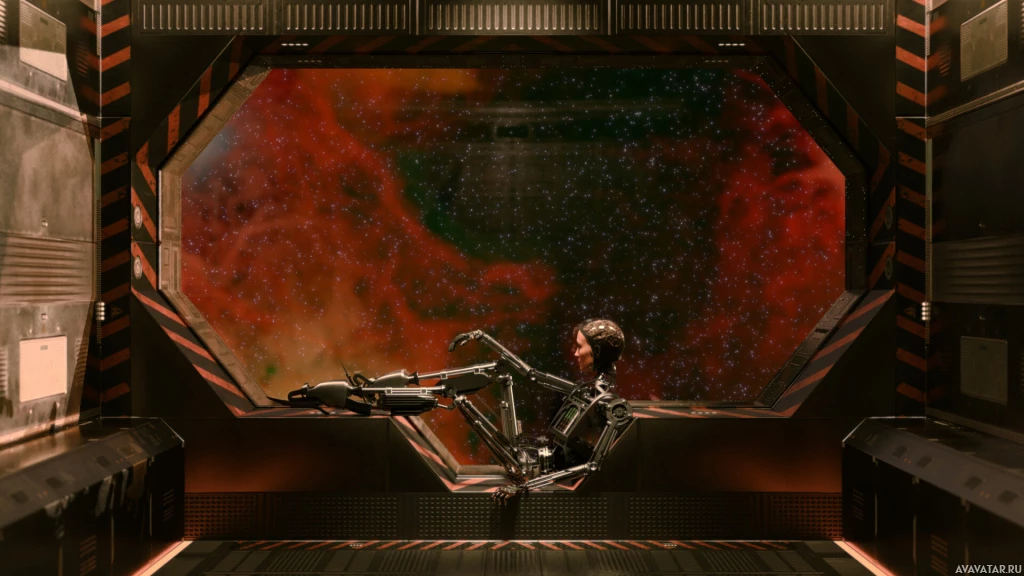 an alien landscape visible through the window-like structure in front of the character. The setting includes mechanical and futuristic elements that are common in