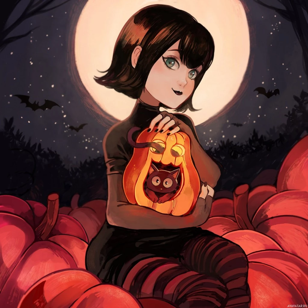 a full moon and silhouettes of trees and bats can be seen in the background, which are common elements associated with Halloween celebrations. The character appears to be dressed in a costume suitable for a spooky occasion like Halloween. There are no vampires or animated movie references that apply to this image.