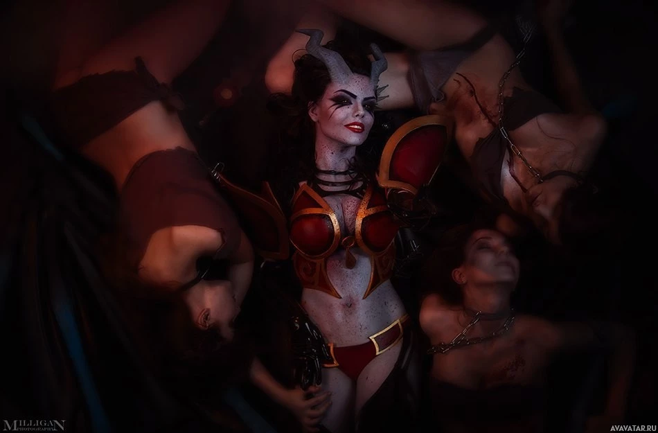 role in the game. The background appears chaotic with several figures that seem to be either dying or being defeated by the Queen of Pain, suggesting an intense