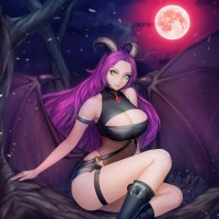 an animated character with the appearance of a succubus, which is typically associated with fantasy and mythology. She has purple hair, wings, horns, and pointed ears that resemble those of a devil or demon, as well as a tail. Her attire includes what seems to be black lingerie and boots, adding to the sensual and alluring nature of her
