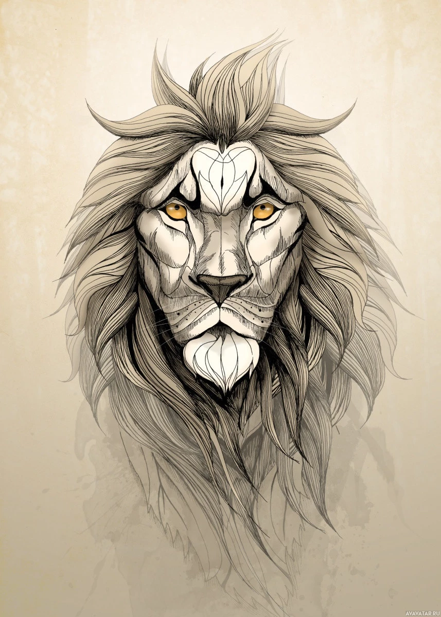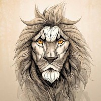 The image features a detailed drawing of a lion's head. The lion is depicted with its mane, facial features such as the eyes, nose, and mouth clearly visible. The artwork appears to have a realistic style with attention to