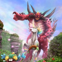 a fantasy scene featuring a unicorn with wings, a horn, and a mane of rainbow colors. The unicorn is accompanied by two creatures that resemble Pokémon. They have