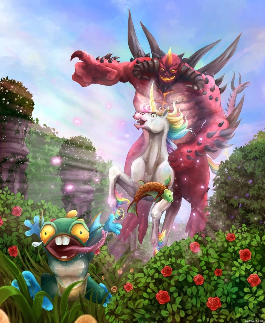 big eyes and are colored in vibrant shades. A demon character with red skin,
