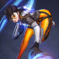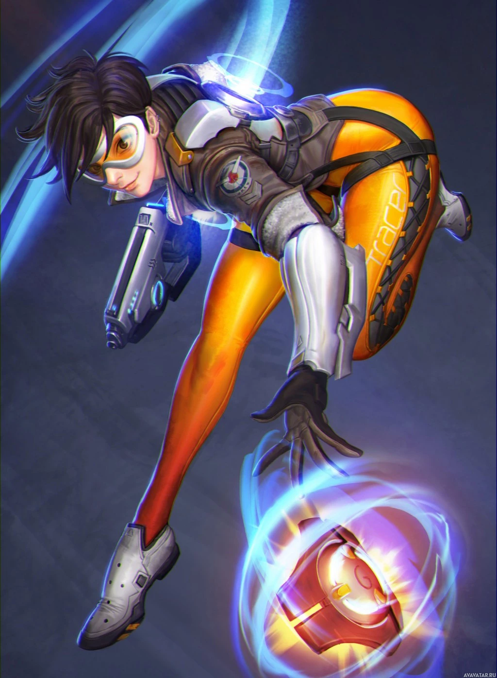 the video game "Overwatch." The character is Tracer, a hero known for her ability to manipulate time and use energy-