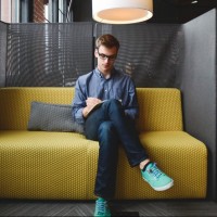 На снимке изображен мужчина, сидящий на желтом диване в офисной обстановке. Он носит очки и, похоже, пользуется ноутбуком или читает какие-то бумаги, которые лежат у него на коленях. Его позиция предполагает, что он может делать перерыв, работать удаленно или участвовать в случайной деловой встрече. Офис имеет промышленный вид с открытыми кирпичными стенами и современной мебелью.