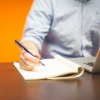 The picture shows a person sitting at a desk, taking notes on a notebook. They have a laptop in front of them and are holding a pen, suggesting that they might be working or studying. The individual appears to be focused on their tasks.