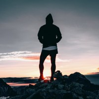 a rocky outcrop with their back to the viewer, silhouetted against the sky. They appear to be looking off into the distance or possibly observing something in the horizon. It's