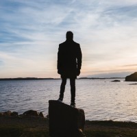 silhouette effect emphasizes the shape and form of the person against the bright backdrop. The overall atmosphere suggests a moment of solitude or contemplation at the edge of the water.