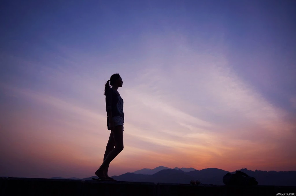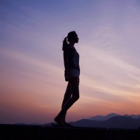 The image shows a silhouette of a person, likely a woman or girl, standing with her arms outstretched towards the horizon. She appears to be at sunset or dusk, given