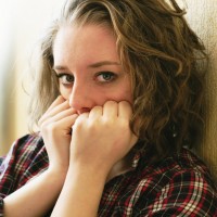 In the image, there is a young woman with short curly hair. She appears to be indoors and has her hand up near her mouth as if she's thinking or perhaps reacting to something. The background is somewhat blurred but suggests an indoor setting, possibly a room in a house or an apartment.