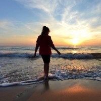 the shoreline at sunset. The individual appears as a silhouette against