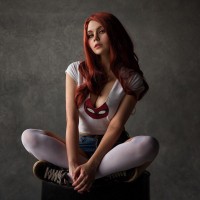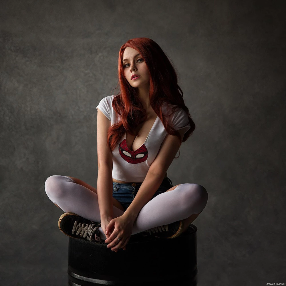 Jane Watson, a character from the Spider-Man comics and movies. The individual is wearing a white t-shirt with