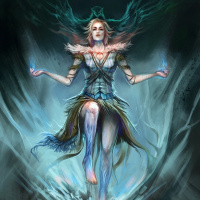 blue energy, which could represent magic or a mystical force emanating from her hands. The background features dark,