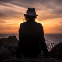 warm hues, suggesting the time of day is around dawn or dusk. The individual is wearing a hat and has their back turned towards us, which gives