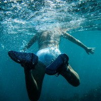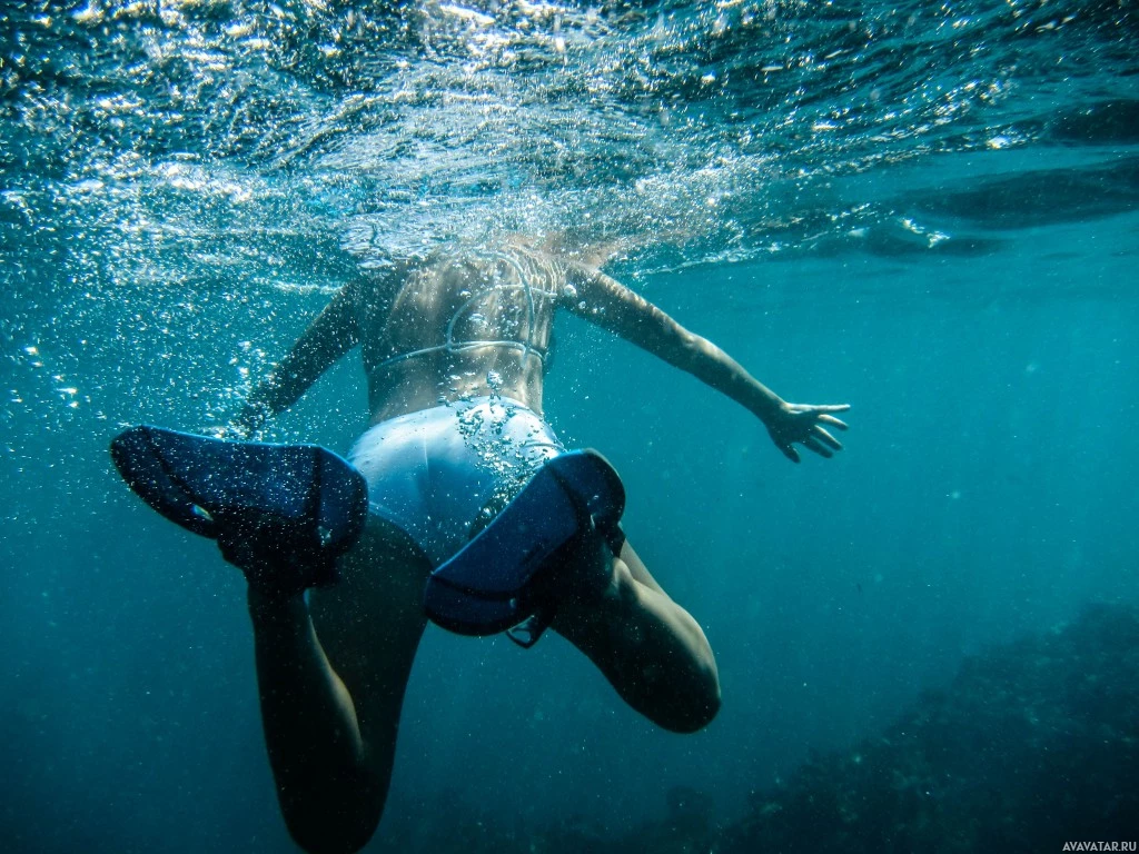 The image shows a person swimming in the ocean. The individual is wearing snorkeling gear, including flippers and a snorkel, allowing them to dive into the water. From this perspective, taken from behind, you can see their back and part of their legs as they are submerged up to their waist. The