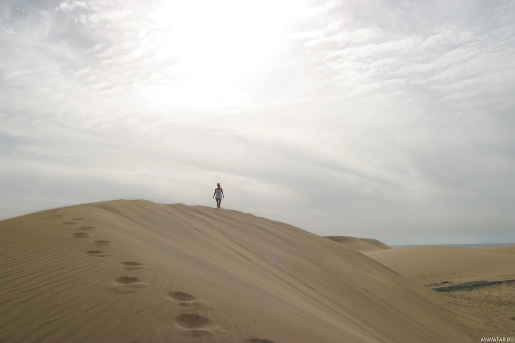 The image shows a vast sandy landscape with footprints on the surface, indicating recent
